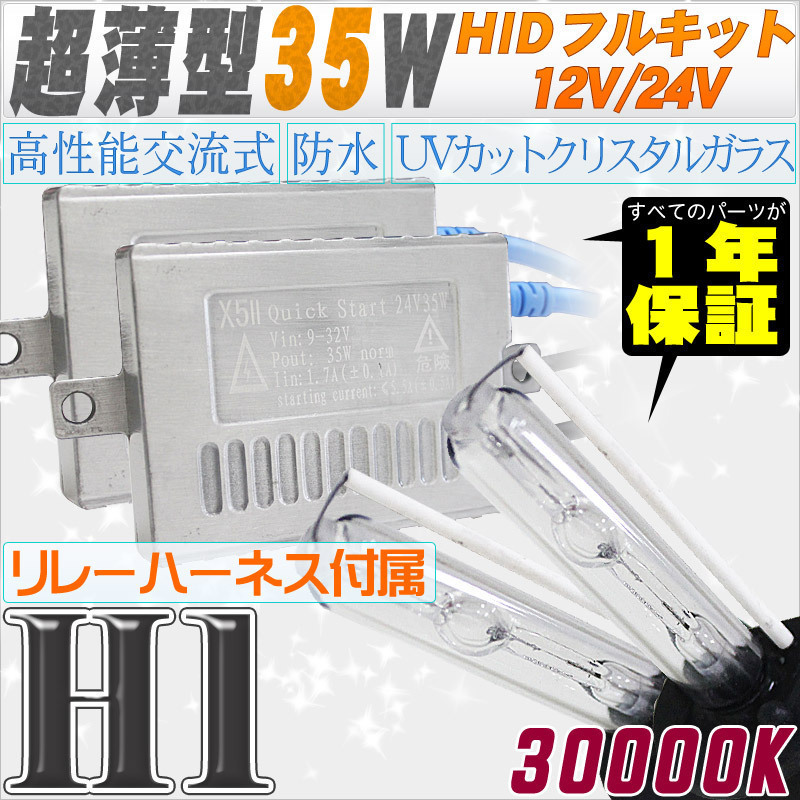 > 高性能 薄型HIDキット 35W H1 リレー付 30000K 12V/24V 【交流式バラスト&クリスタルガラスバーナー】