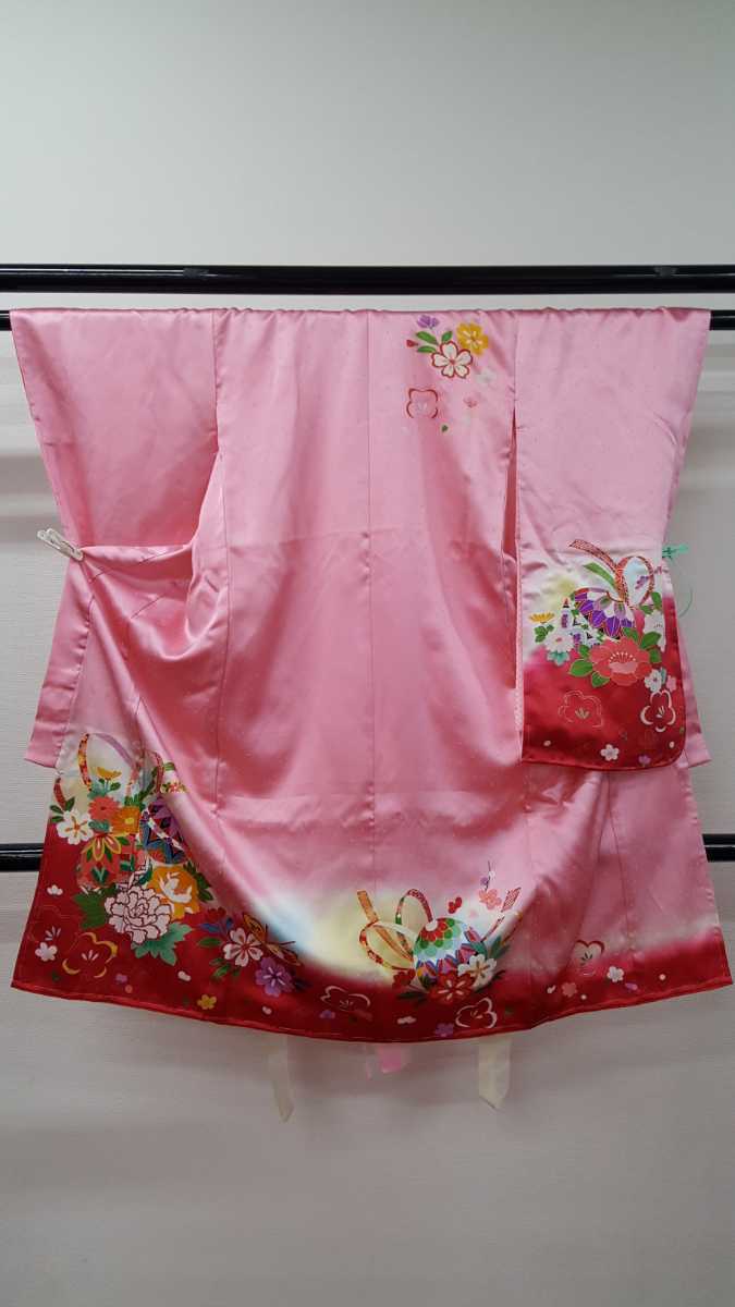 - 【加968】七五三 3歳 着物&長襦袢2点セット振袖 お祝い 撮影 記念 正月 式典 サテンピンク 赤 花 鮮やか 210623