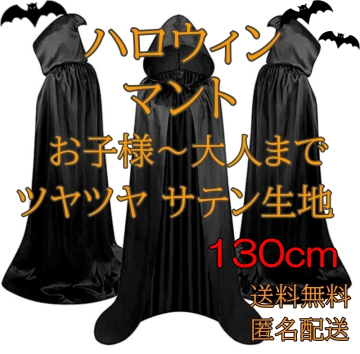 - ハロウィン マント 黒 サテン生地 子供 大人 130㎝ フード付き