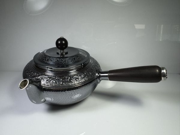 - 純銀製 横手急須 木摘 木取手 銀瓶 煎茶 長さ約18cm 純銀保証