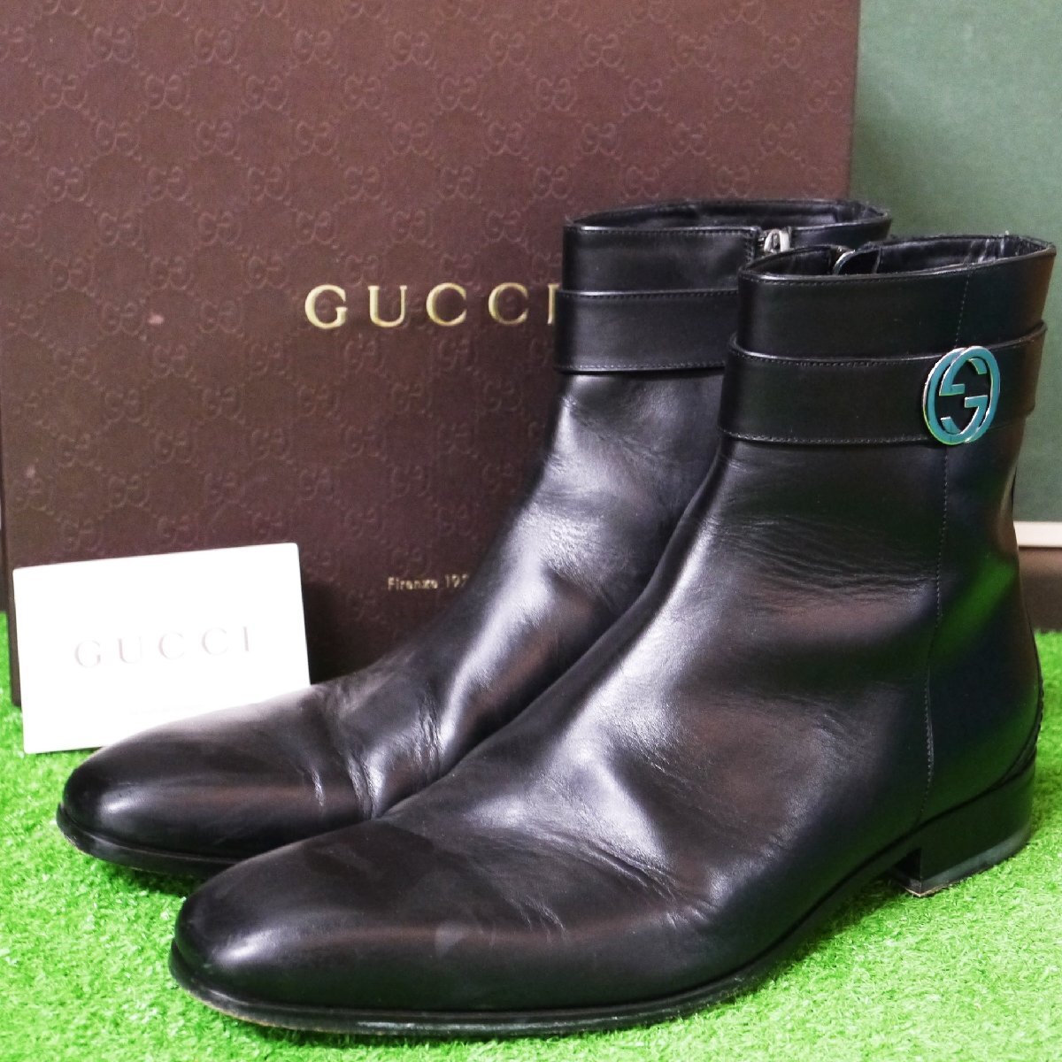> USED品・保管品 GUCCI グッチ サイドジップ ブーツ インターロッキングG レザー ブラック 39 1/2E 外箱付