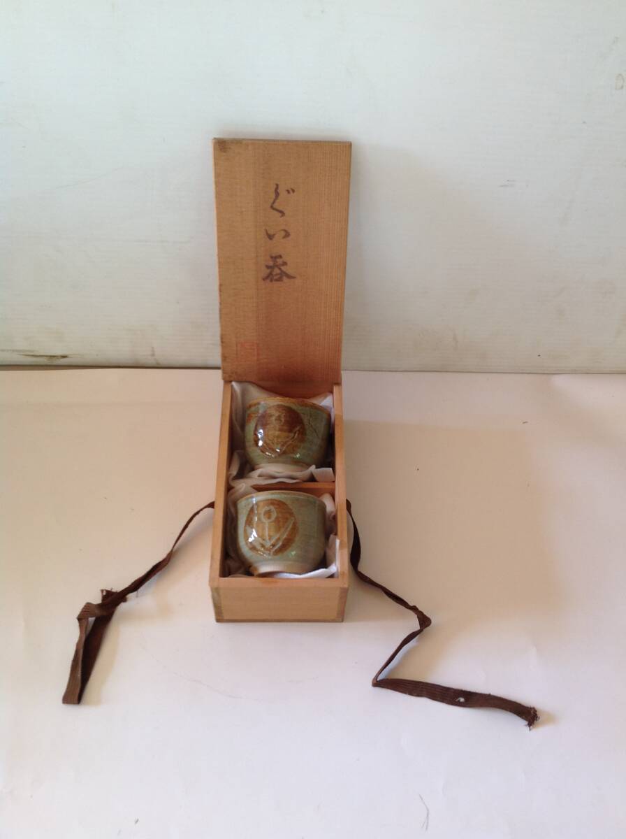 - *越中五箇山 清音焼 ぐい呑 陶器 花文 紅寿陶苑 在銘 酒器 酒盃 猪口 2客 箱付 中古品*
