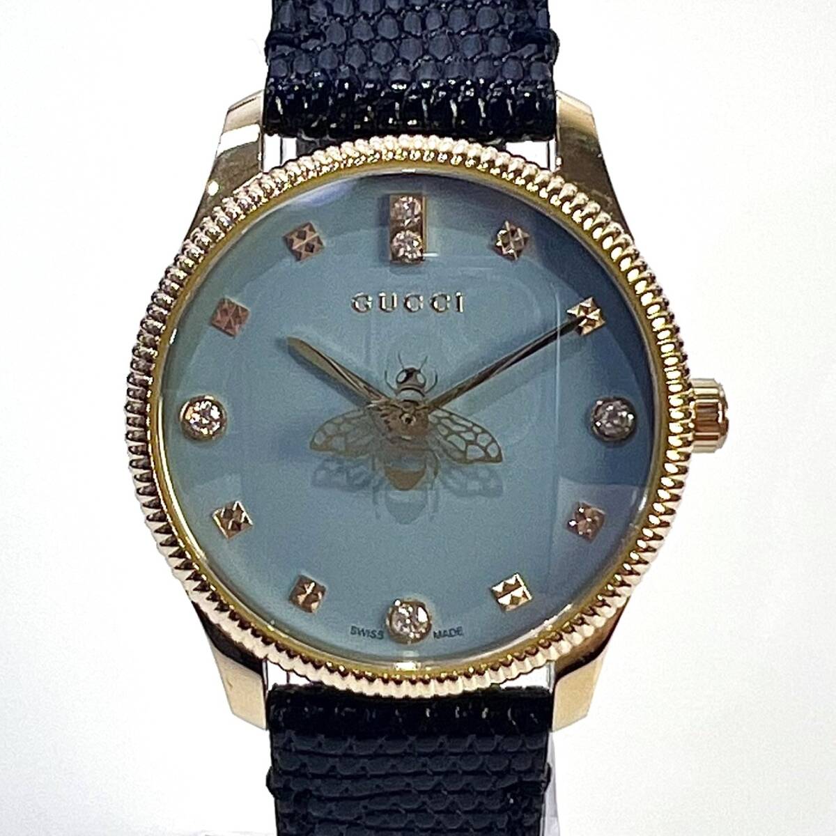- GUCCI グッチ Gタイムレス 5P ダイヤ 蜂モチーフ レディース クオーツ 青文字盤 腕時計 126.5/18169875 リザード 29mm 箱 稼働中 美品