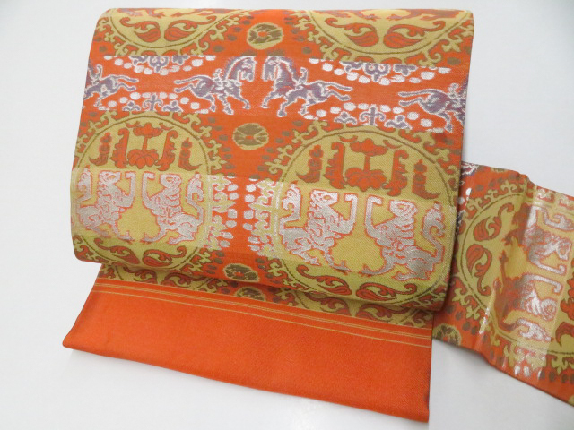 - 《京都一輝堂》【着物】アンティーク 九寸名古屋帯 全通柄 双獣文 25b01-57