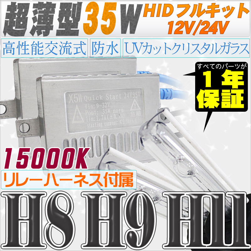 - 高性能 薄型HIDキット 35W H11/H8 リレー付 15000K 12V/24V 【交流式バラスト&クリスタルガラスバーナー】