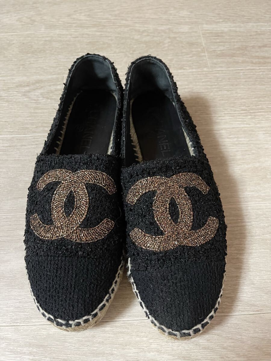 > 1000円~未使用近い!正規品 極美品 CHANEL シャネル ココマーク ツイード生地 エスパドリーユ シューズ ブラック