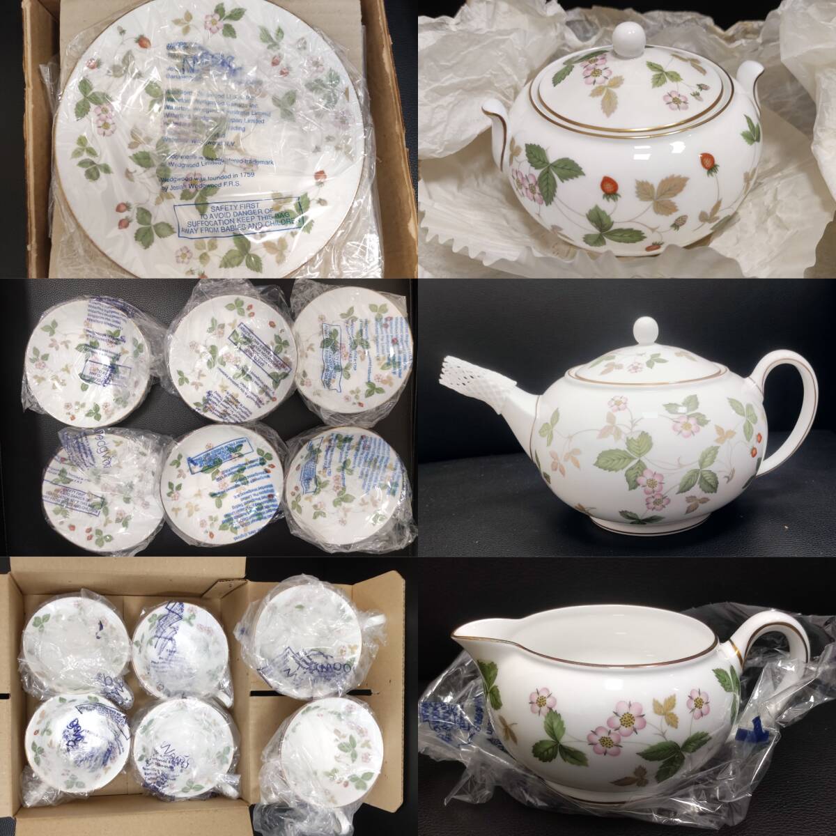 > ほぼ未使用★黒壺★ウェッジウッド ワイルドストロベリー カップ&ソーサー6/20cmプレート6/ティーポット/クリーマー/シュガーボックス