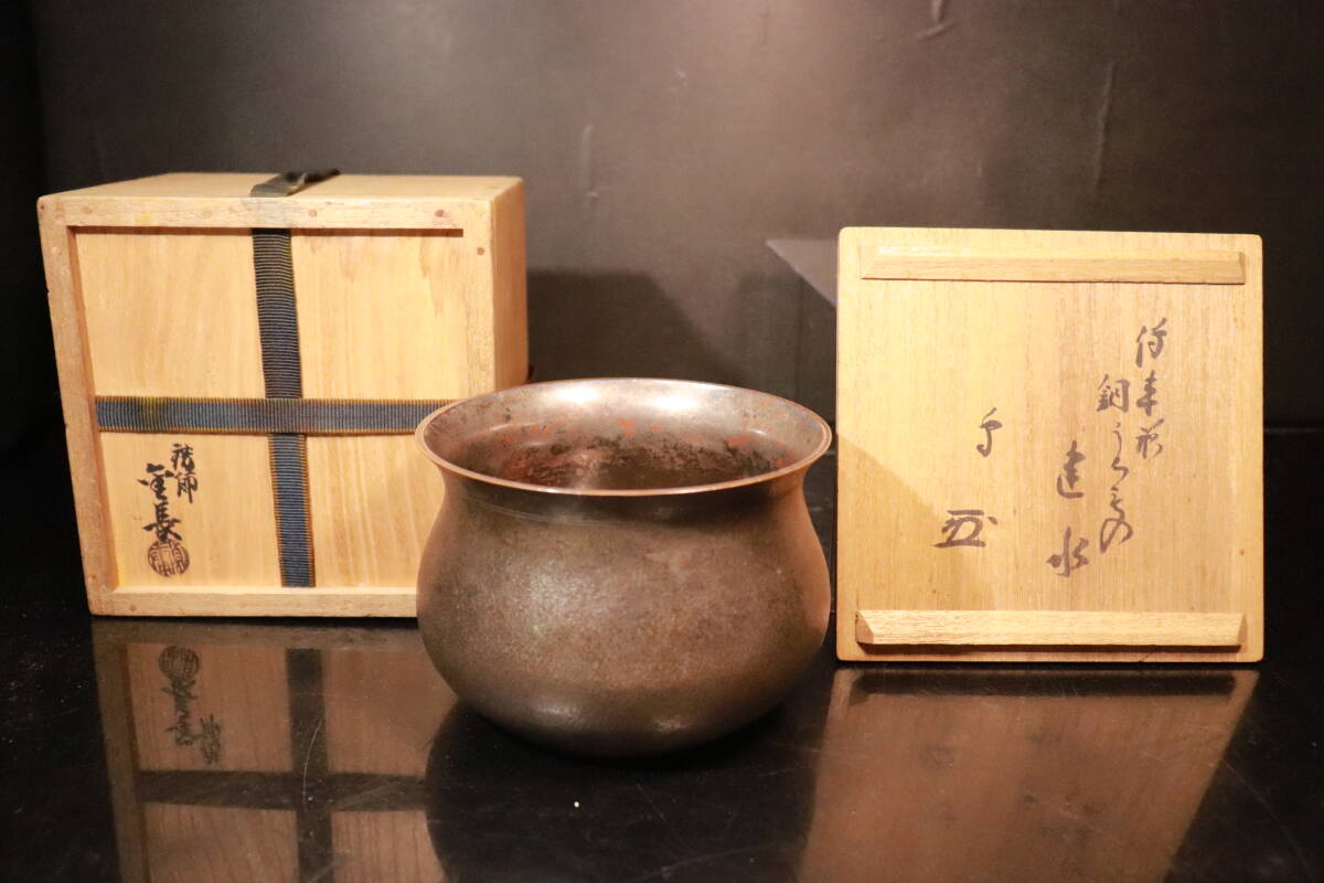 - 【hiro】武者小路千家 官休庵十二代愈好斎聴松 書付 錺師 大森 金長 造 傅来形 銅建水 共箱 ★検索★ 炉 香合 鉄瓶 茶碗 釜 茶道具