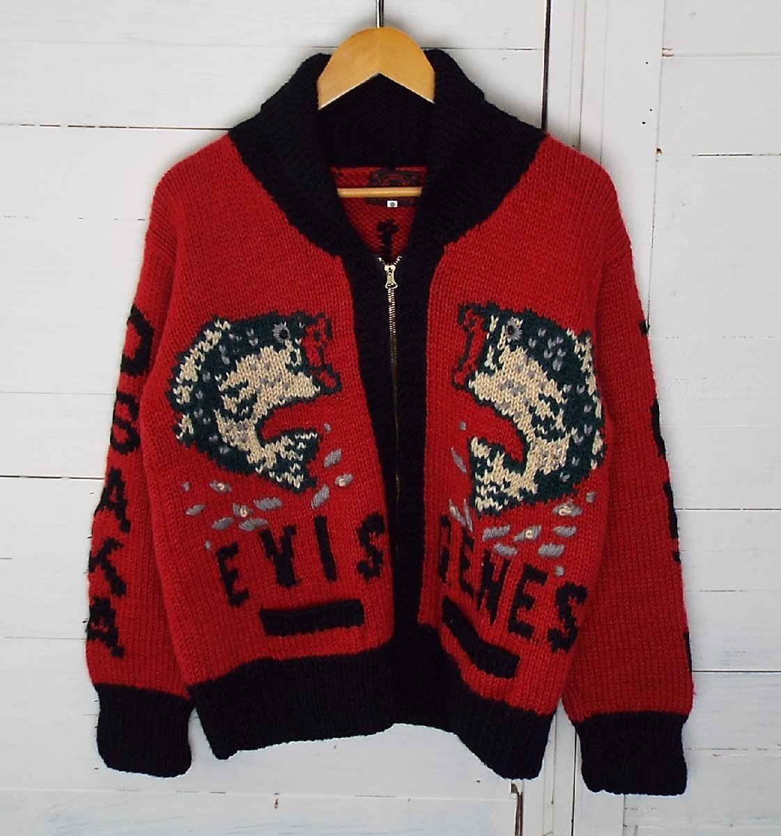 - T4172〇EVISU/エヴィス,エビス カウチン ニット カーディガン ジャケット ブラックバス ウール レッド系 サイズ38