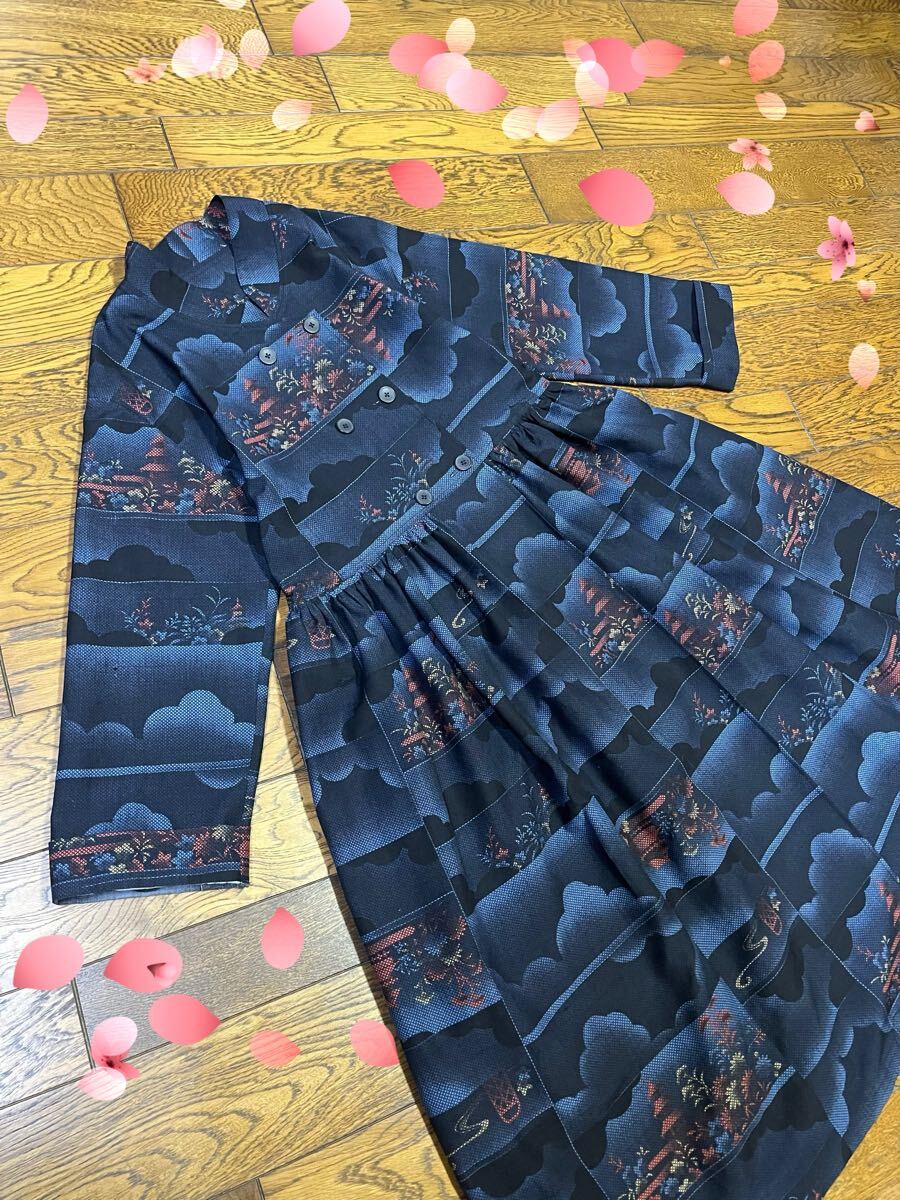 - 京染め/手織紬/未使用反物/格子に寺院風景模様/ワンピース/コート/前開き/スタンドカラー/ダブルボタン/長袖/着物リメイク/紺系