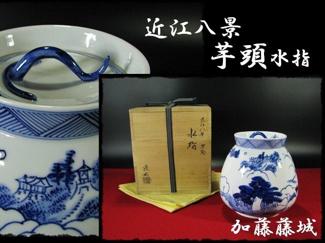 > ∴名工館∴【送込!近江八景 芋頭 水指】加藤 藤城 染付 茶道具 四方桟 共箱 上位品 無傷 真作保障 送料無料 1 e170