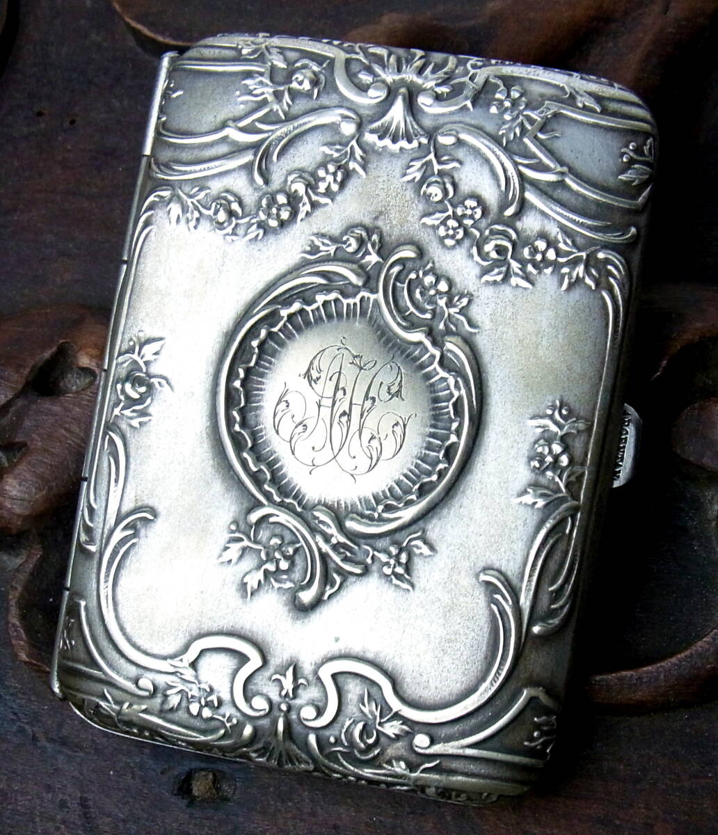- 優美 フランスアンティーク ロカイユ意匠のシガレットケース カードケース ヴェルメイユ装飾 モノグラム刻印 argentan シルバープレート