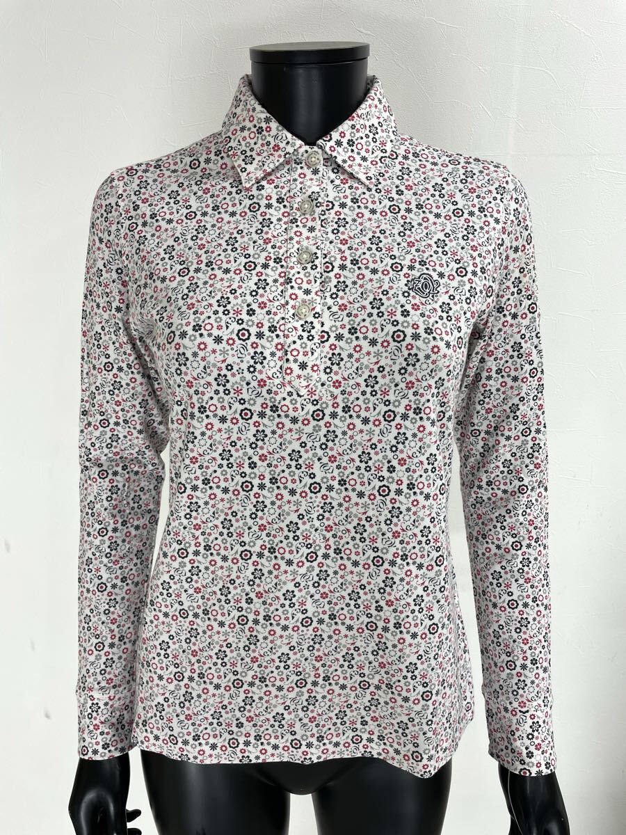 - 【USED】ZOY ゾーイ 綿 ストレッチ 長袖 ポロシャツ ロゴ刺繍 総柄 ホワイト 白 レッド 赤 ブラック 黒 レディース L ゴルフウェア