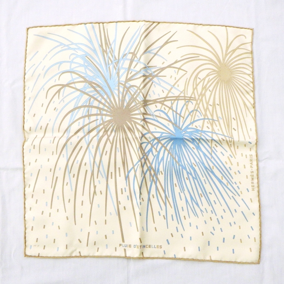 - A25-2012 Herms HERMES エルメス スカーフ プチカレ PLUIE D'ETINCELLES 花火の雨 シルク ベージュ×ライトブルー 箱つき レア