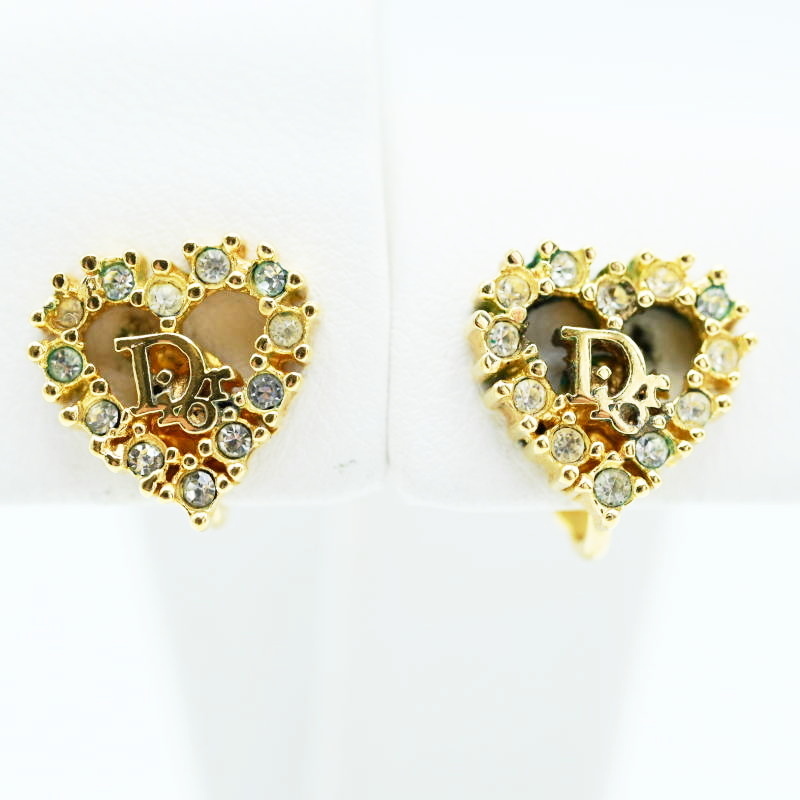 - T05-k040 Christian Dior クリスチャンディオール ハート/ロゴ ラインストーン GP イヤリング ゴールド