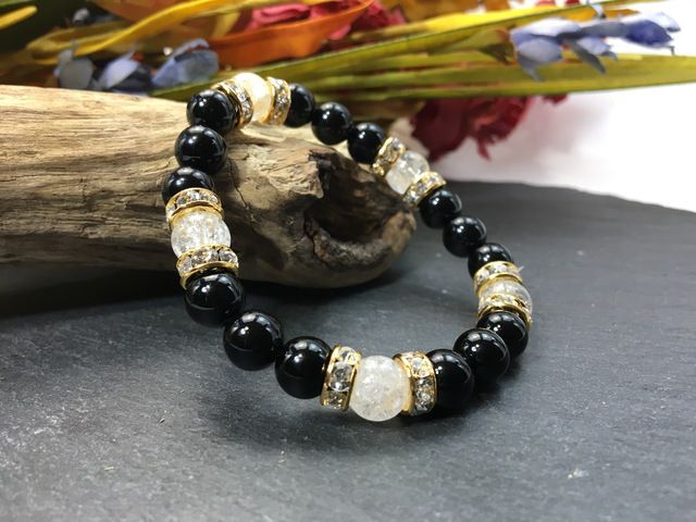 - オニキス&クラック水晶 パワーストーン ブレスレット 天然石ブレス (ゴールド) 開運 浄化 邪気払い 魔除け レディース 通販 ブラック 黒