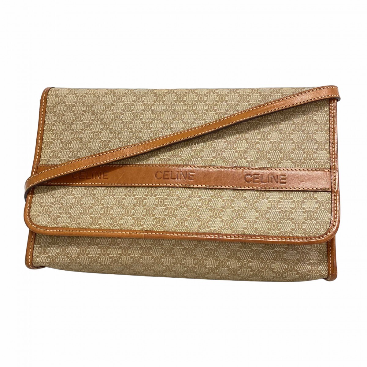 > ★SALE【5id4189-h】セリーヌ ショルダーバッグ マカダム PVC ベージュ ブラウン ゴールド金具【中古】レディース