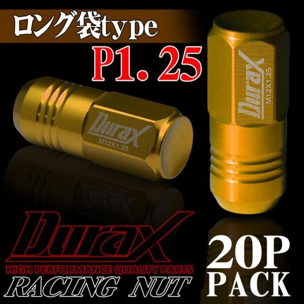 > ホイールナット DURAX製 アルミナット ロング袋ナット 50mm レーシングナット 20個 金 ゴールド P1.25 長袋型 日産 スズキ 125KLF