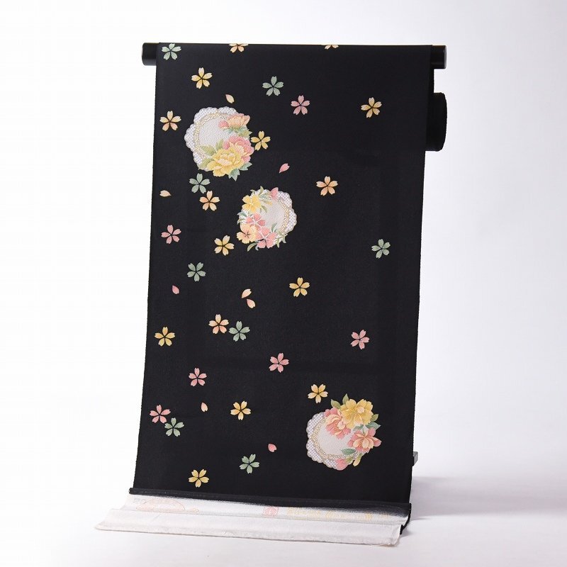 - 【ほりだし堂】 小紋 花の丸文様 黒色 反物 正絹 着物 着尺 丹後ちりめん 女の子着物 四つ身にも