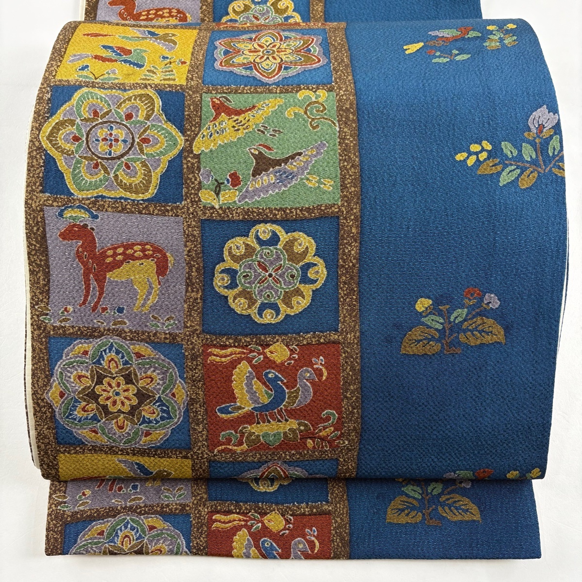 > 袋帯 秀品 動物 草花 縮緬 青 全通 正絹 【中古】