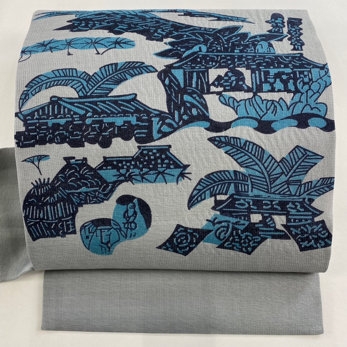 - 名古屋帯 秀品 夏帯 縦絽 建物 葉柄 灰緑 正絹 【中古】