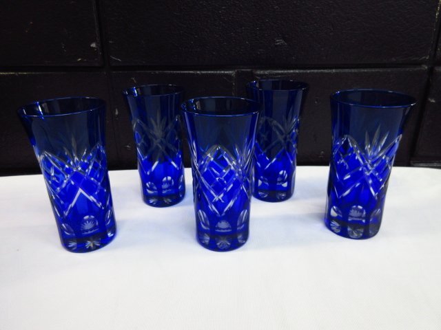 > m2630 美品 切子グラス 5点セット ブルー ガラス製 グラス/小タンブラー/酒器/小ビールグラス/冷酒など 口径約5.5cm 高さ約10.5cm