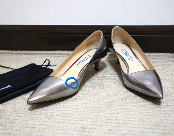 > 【即決】良品方 6、7回の使用 PRADA プラダ◆保存袋付 光沢 シルバー ガンメタ パンプス 37.5 日本サイズ24~24.5㎝位 yu