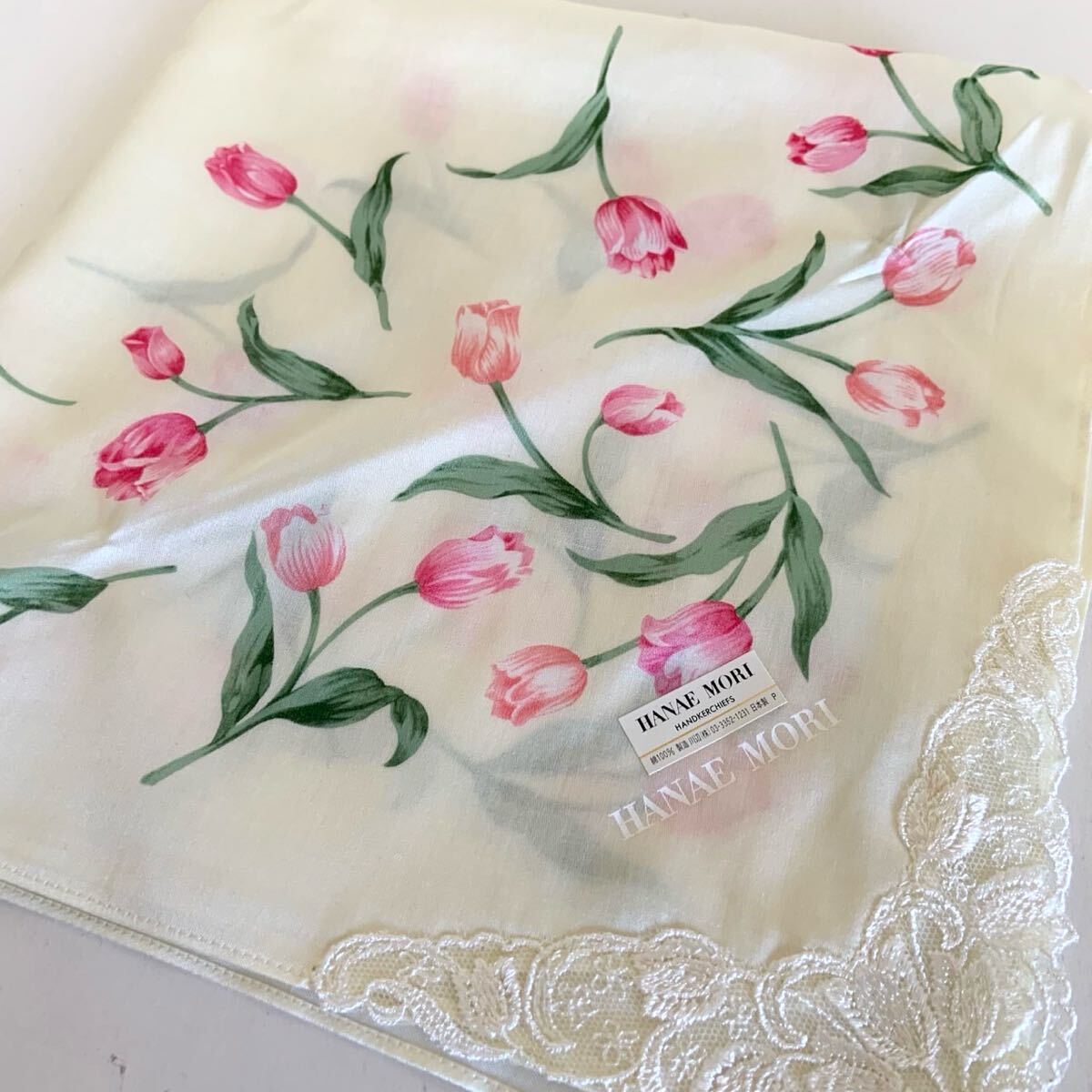 > 未使用 ハナエモリ HANAE MORI 大判ハンカチーフ 約52×52cm 綿100% 花柄 レース ホワイト系 日本製 レディース スカーフ ハンカチ