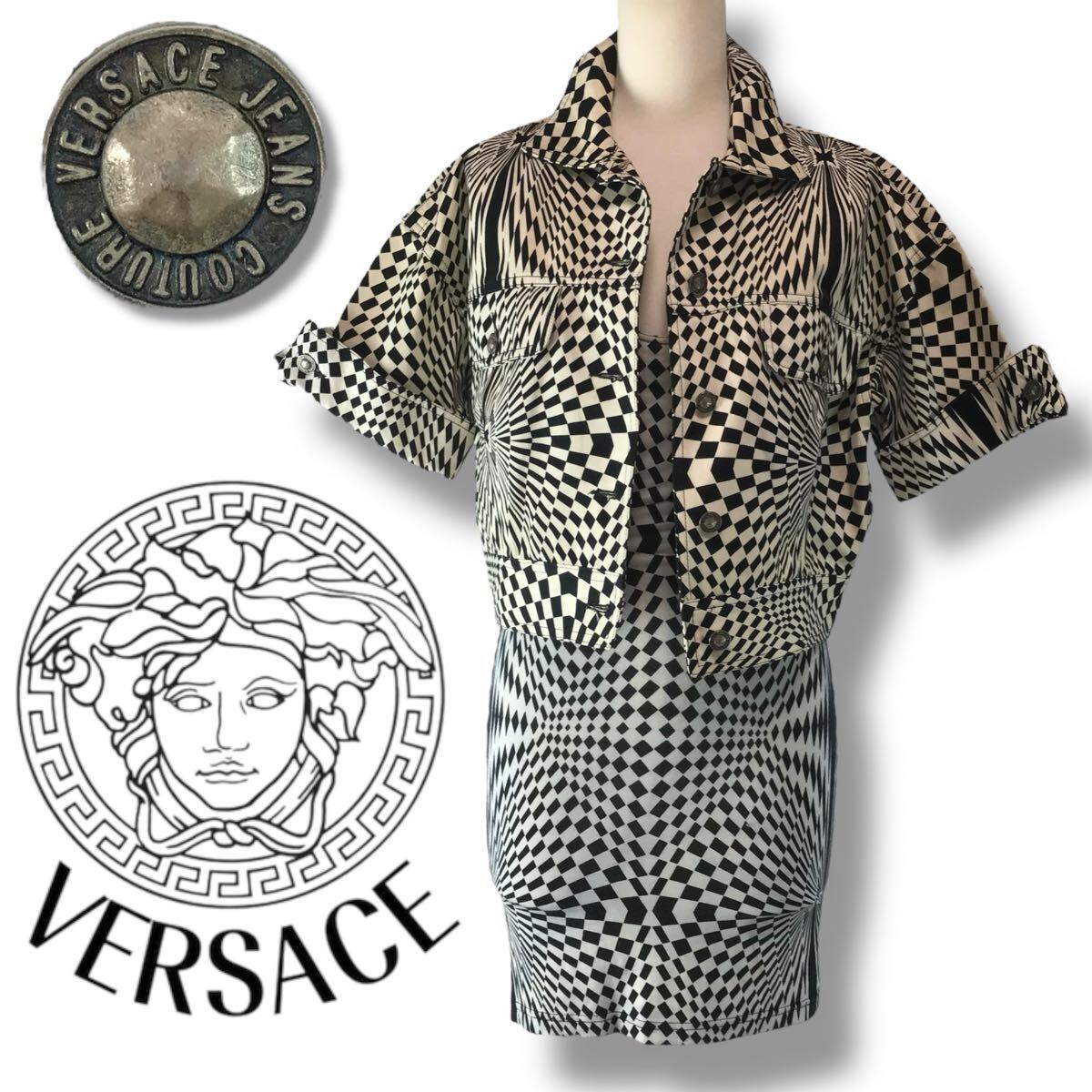 - d13 レア 希少 Vintage VERSACE ヴェルサーチ 半袖 デニムジャケット ノースリーブ ワンピース Gジャン タイトドレス 正規品 2点セット