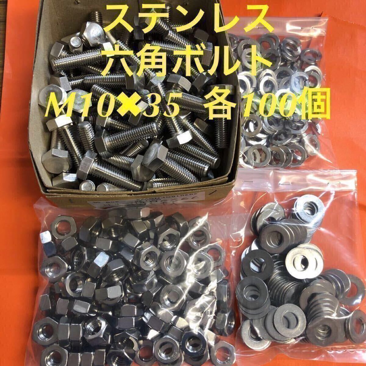 > ★送料込★ステンレス 六角ボルト M10×35 ナット・丸ワッシャー・スプリングワッシャー 各100個 ステン六角ボルト