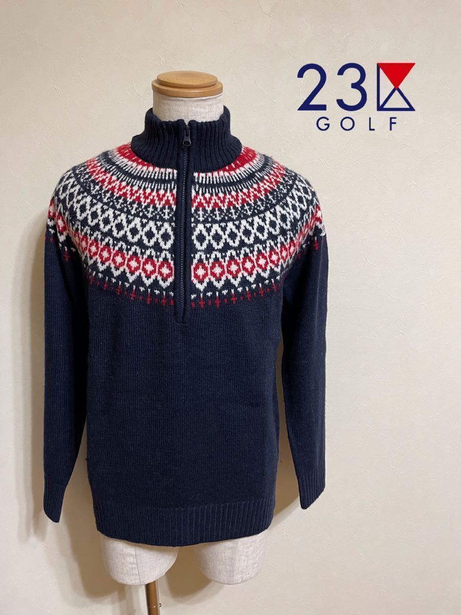 - 【美品】 23区GOLF ハーフジップ ニット セーター ノルディック柄 トップス ゴルフ ウェア サイズL 長袖 ネイビー オンワード樫山