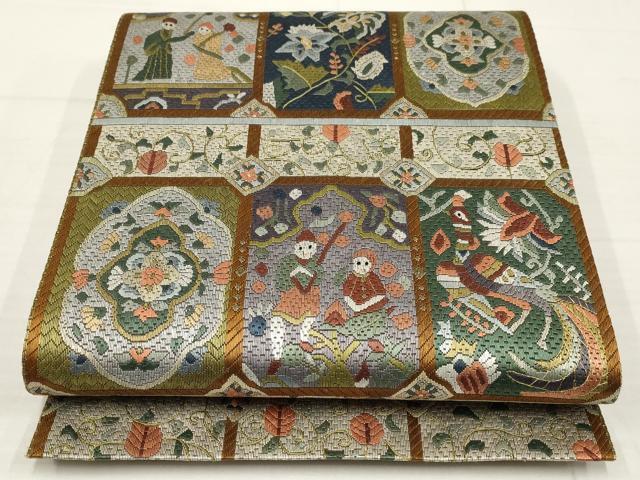> 平和屋着物▼絽刺し 区限刺繍 全通柄袋帯 人物花鳥文 金糸 正絹 逸品 AABB1110wj