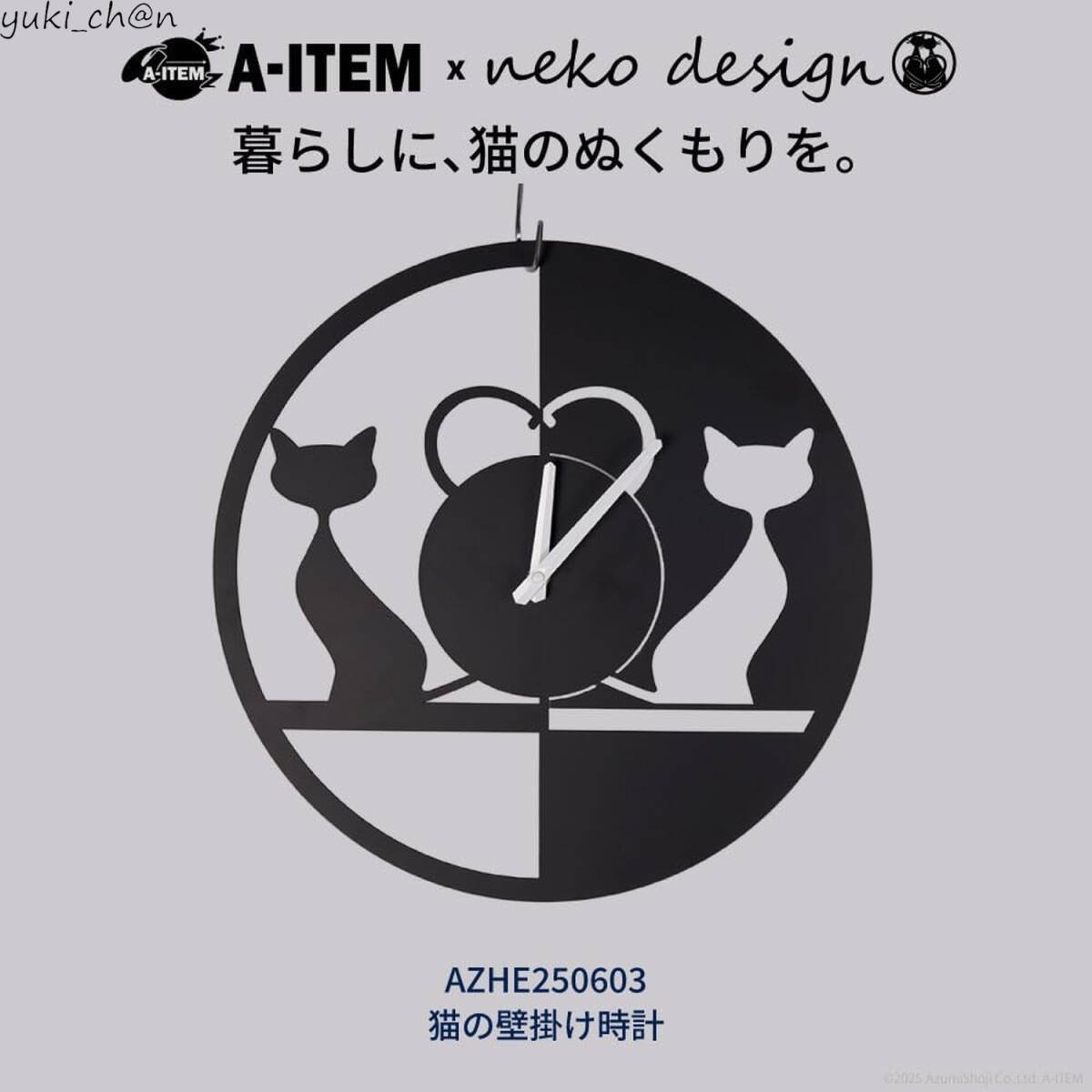 > neko design 壁掛け時計 ブラック 猫モチーフ 直径40cm シンプル 可愛い デザインクロック ビッグサイズ 大型