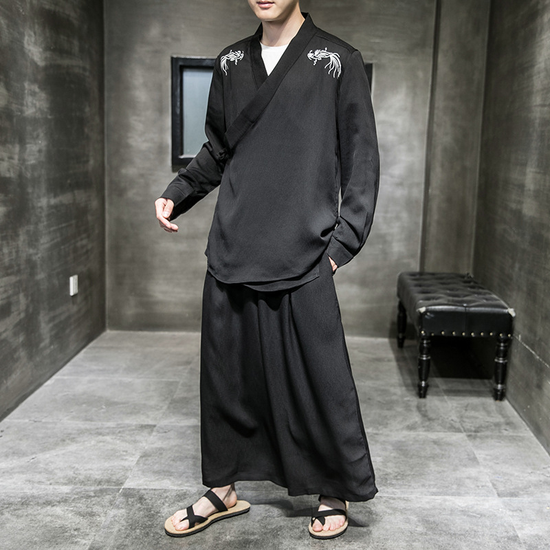 - 上下セット 羽織 長袖 ワイドパンツ メンズ 甚平 刺繍ロングパンツ サルエル セットアップ 花火大会 夏祭り イベント ゆったり M~5XL 黒