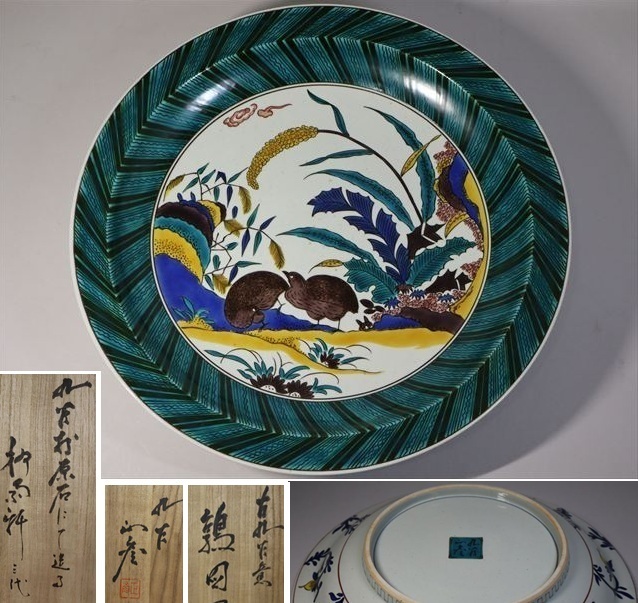- ★人間国宝 三代徳田八十吉(正彦)九谷村原石使用作 古九谷写鶉図大皿 39.5cm 1尺3寸 特別作品