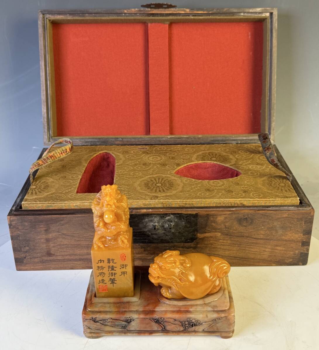 > 『三希堂』 清代 乾隆御用内務府 老寿山石 田黄石彫 細工 手彫り 中国古賞物 重量:323.2g(台座を含まない) 高さ12.2cm 底径7.7cm C47