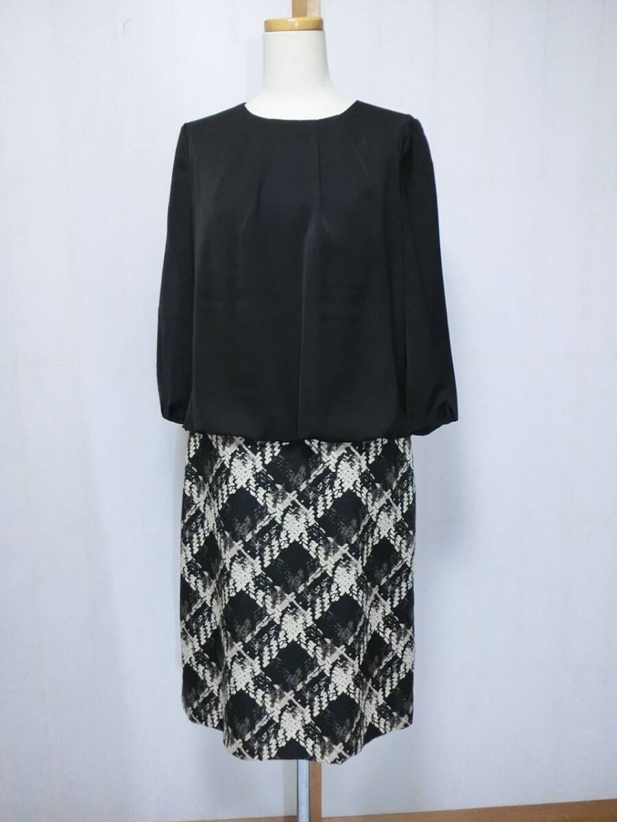 - ★Leilian レリアン 黒い9分袖ブラウスに斜め格子のスカートを組み合わせたワンピース 7★