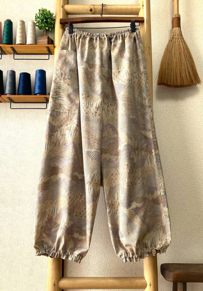 - 鎌倉まるか堂 着物リメイク 紬 秋色山花の切嵌めもんぺ風 ●絹 ●ゆったりまるっこいシルエット M~L●裾ふわパンツ●洗濯OK
