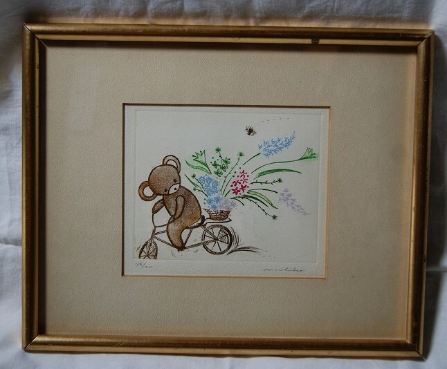 - A517★真作保証サイン入り・自転車に持った・くまさんと花束*159枚目・200分の版画木製額入り