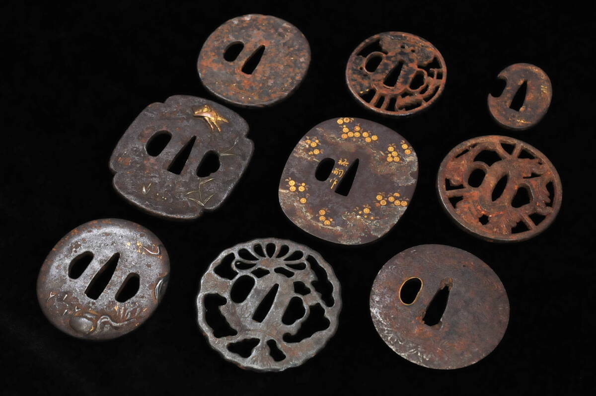 - 【鍔】 鉄地鍔9点まとめ 木瓜型象嵌 透かし丸鍔 象嵌盛り鍔 小刀用鍔等 鐔 刀装具 拵え 刀 03408052-6