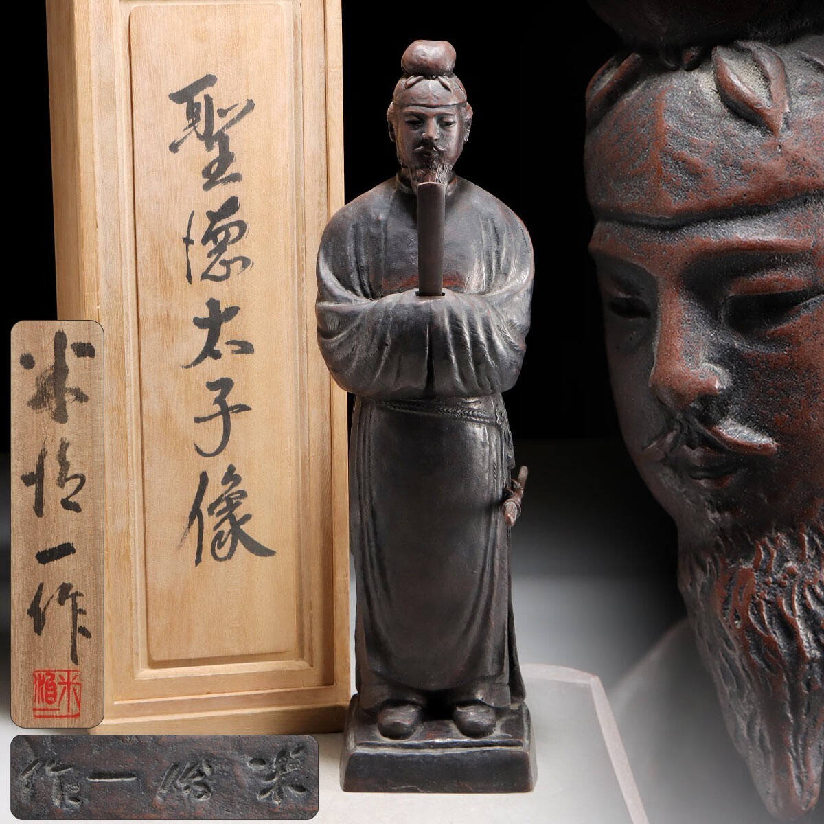 彫刻美術 【米治一】 ブロンズ 聖徳太子像 人物像 銅像 共箱の出品です。