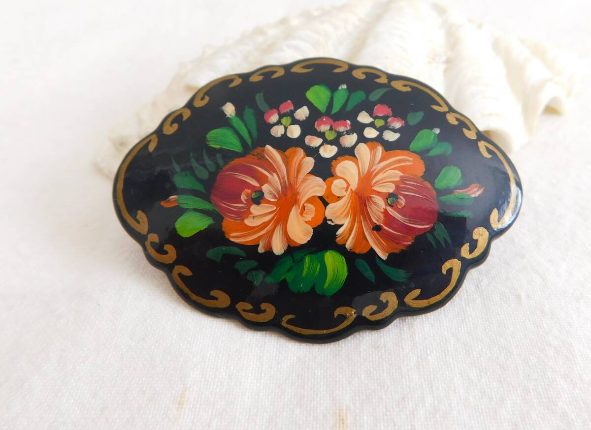 - ヴィンテージブローチ ハンドペイントされた木製のブローチ フラワーモチーフ 花 ビンテージ アンティーク