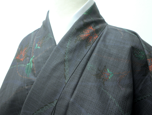 - 《京都一輝堂》【着物】 紬 花 植物文様 身丈約166cm 裄丈約66cm 24Z-100