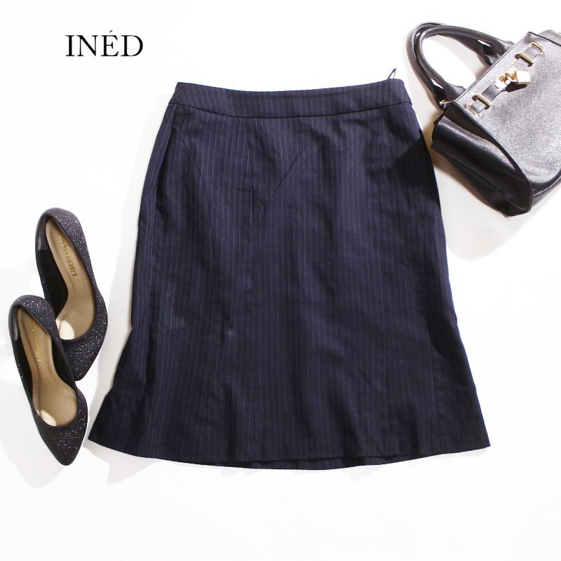 > 美品 イネド INED 株) フランドル 秋 冬 ストライプ柄 ウール混合 スーツ タイトスカート 11号 ネイビー 紺 オフィス 通勤 綺麗 ストレッチ
