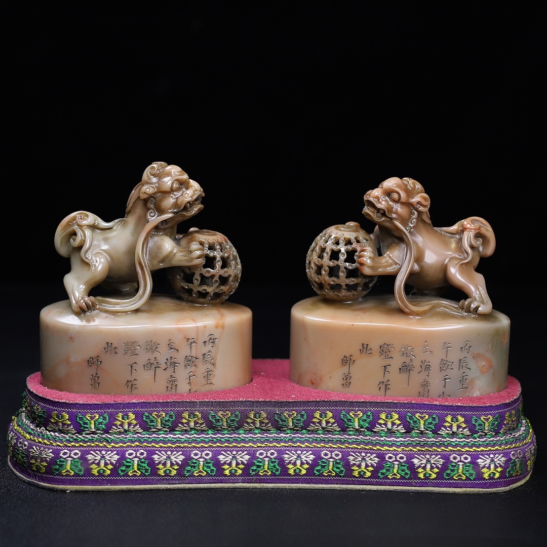- ◆珍蔵◆中国古美術清時代 古寿山石彫り獅子戯球 印章 2点 精品 共箱 細密細工造 置物 擺件 古賞物 骨董品 時代物 AT17