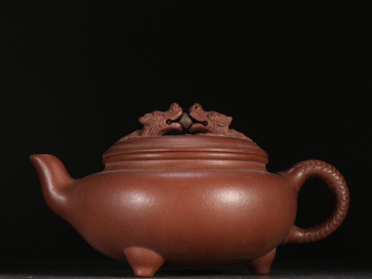 - ▽鴻▽急須 徐漢棠製底款 双龍戯珠鈕茶壺 宜興紫砂 常滑 朱泥急須 煎茶道具 茶壷 時代物 中国古美術 骨董品