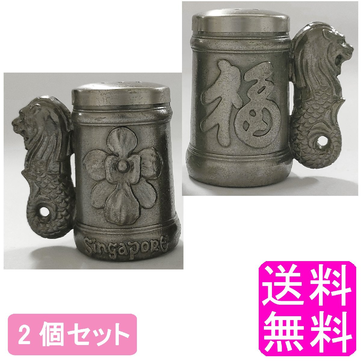 > 送料無料 シンガポール マーライオン 調味料入れ 2個セット Singapore 塩 コショウ 胡椒 塩コショウ キッチン用品 金属 飾り 雑貨 おしゃれ