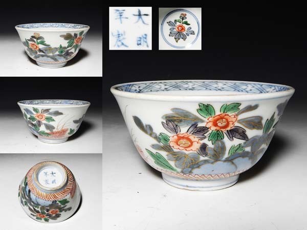 - 【桃】酒器ぐい呑み:清朝民国期色絵草花文様煎茶碗 大明年製