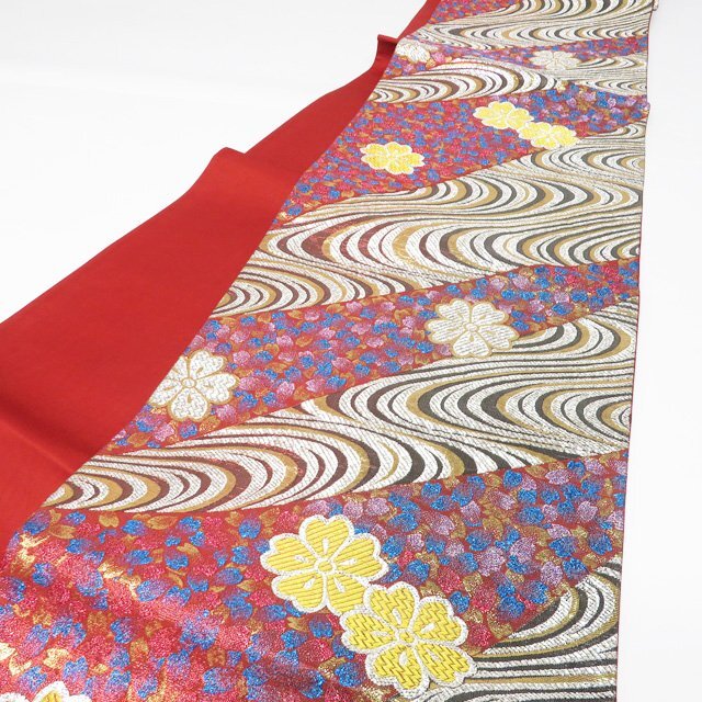 - ★きもの北條★ 振袖用 流水に桜模様 箔糸 六通 仕立て上がり 中古 正絹 袋帯 T804-3