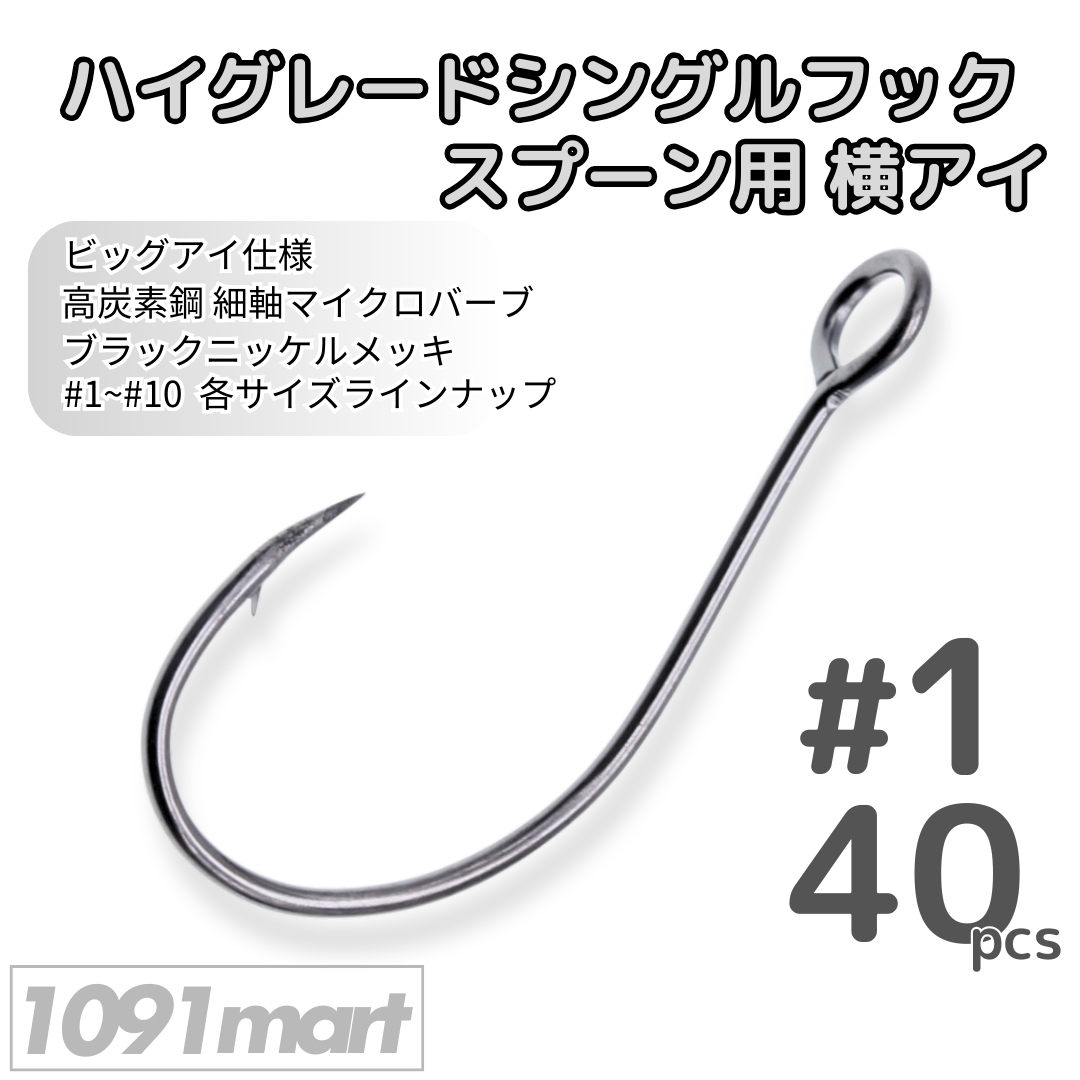 - ハイグレードシングルフック スプーン用横アイ #1 40本セット 高炭素鋼 ビッグアイ 細軸マイクロバーブ 釣り針 ソルト対応【1091mart】